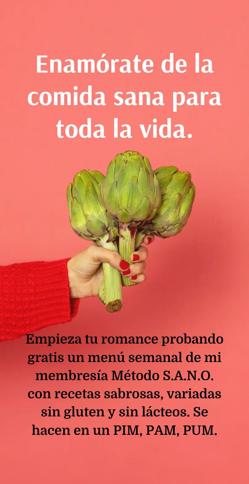 Empieza tu romance probando gratis un menú semanal de mi membresía Método S.A.N.O. con recetas sabrosas, variadas, sin gluten y sin lácteos. Se hacen en un PIM, PAM, PUM.